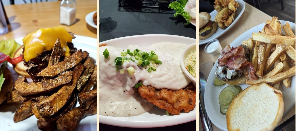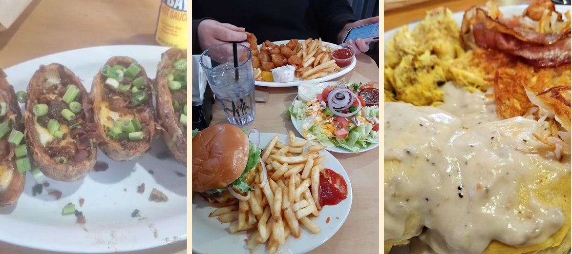 Popular dishes include breakfast items like omelettes and pancakes, along with their juicy burgers and unique appetizers such as Checalapeño Poppers.